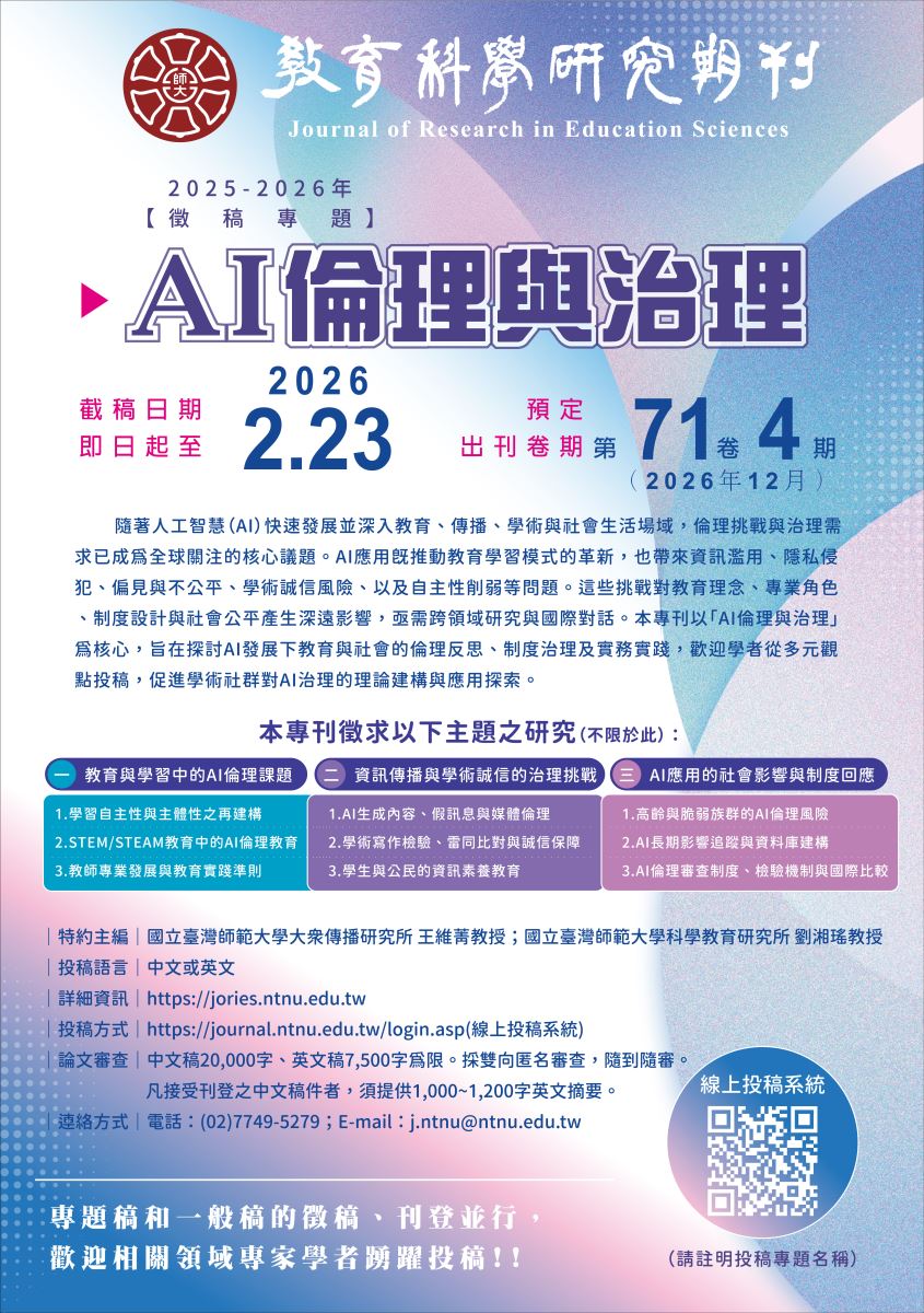 《教育科學研究期刊》「AI倫理與治理」專題徵稿(截稿日至2026/02/23)