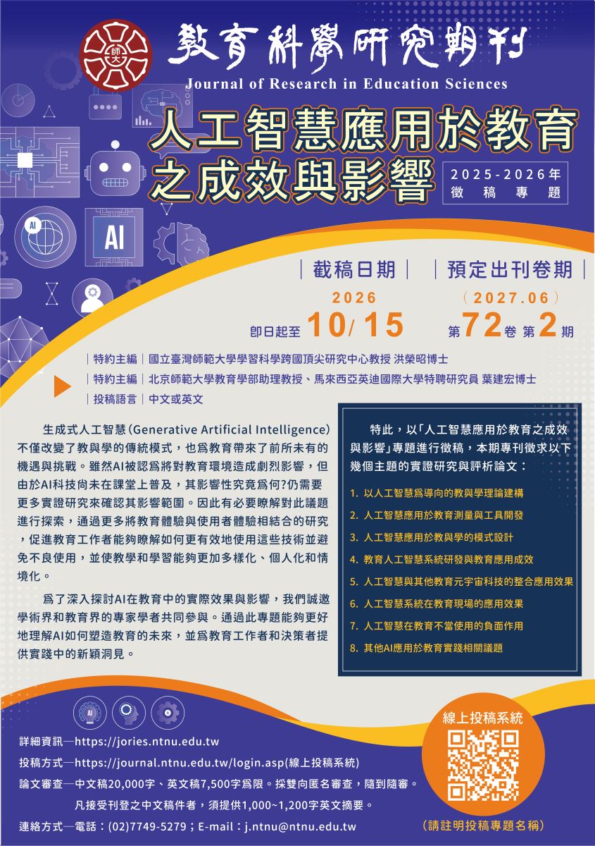 教育科學研究期刊「人工智慧應用於教育之成效與影響」專刊徵稿說明