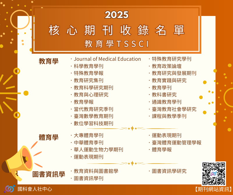《教育科學研究期刊》獲國家科學及技術委員會人文社會科學研究中心評比結果為 教育學門 第一級臺灣人文及社會科學核心期刊(TSSCI), 本次評選之有效期間為 2026 年 1 月 1 日起至 2028 年 12 月 31 日止。 相關資訊請點選TSSCI評比名單資訊。 圖片來源:國家科學及技術委員會人文社會科學研究中心